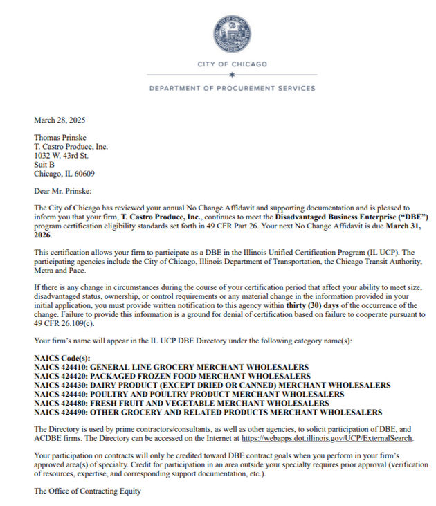 With Illinois being one of the few states to include persons with disabilities in their minority business classification, T. Castro is certified as a Minority Owned Business at all levels of government.